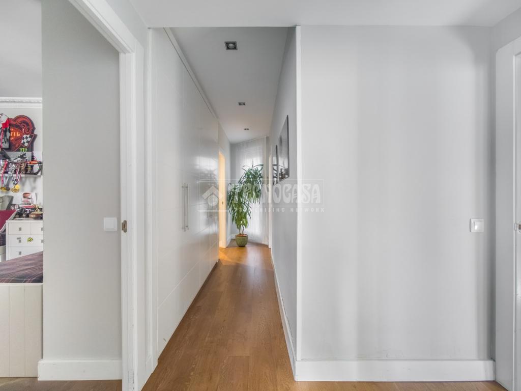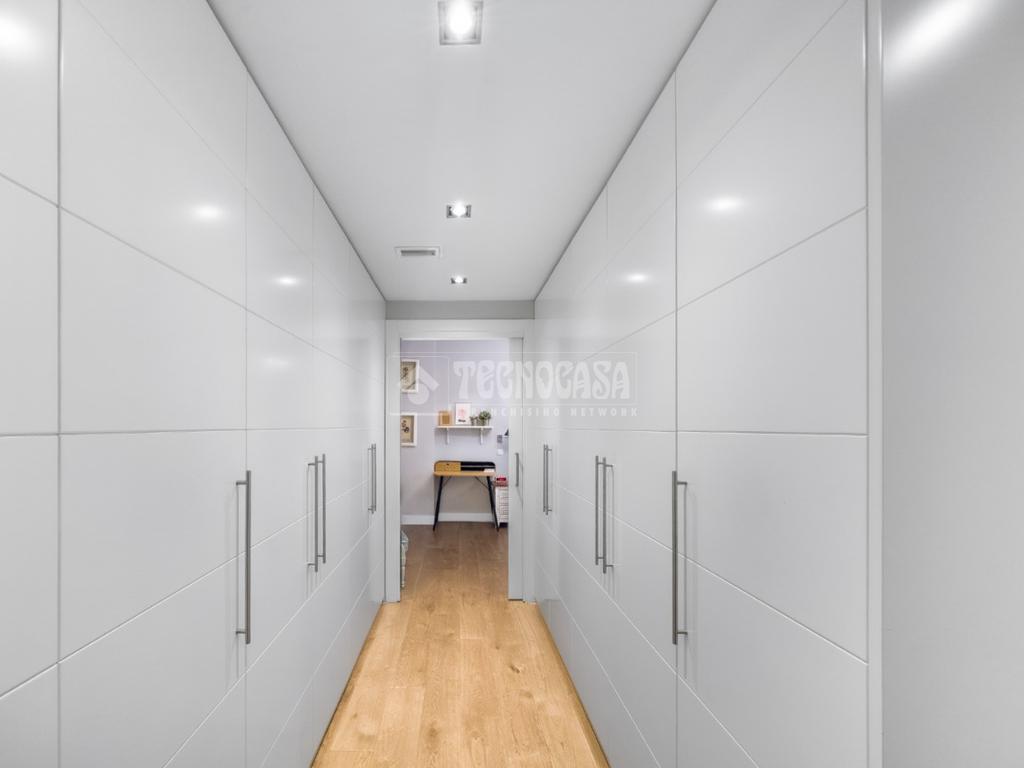 A lo largo del pasillo distribuidor encontramos un práctico armario empotrado de cuatro puertas, ideal para almacenamiento adicional.