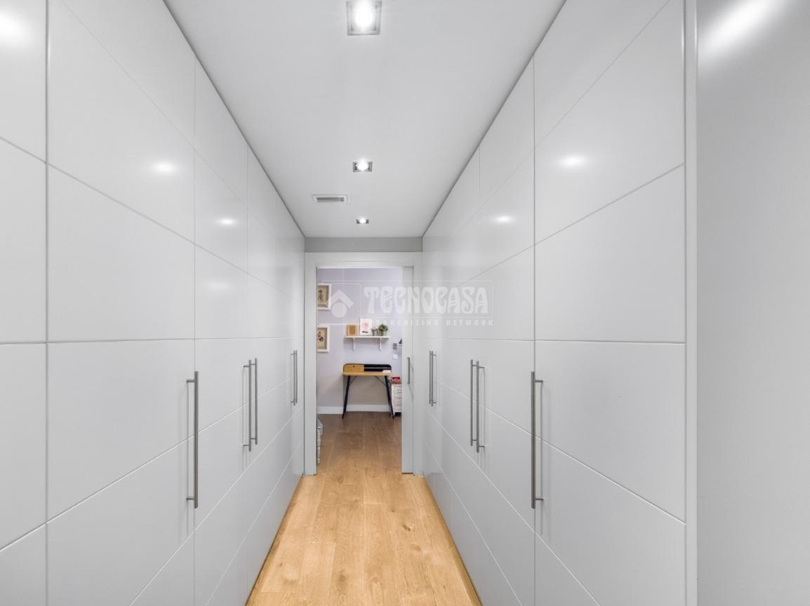 Un dormitorio principal en suite que destaca por su amplitud y diseño, con una elegante zona de vestidor tipo pasarela equipada con múltiples armarios empotrados, conectando el baño privado con la zona de descanso, que permite incorporar cama de matrimonio, escritorio y más.